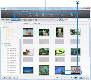 | I | 顯示展開的縮圖按鈕 | 按這個按鈕,視訊與相片群組將在展開的縮圖清單中顯示為縮圖影像。要隱藏展開的清單,再按一次按鈕。 在展開的縮圖清單中,視訊將顯示為一系列縮圖影像,這些影像是依預先設定的時間間隔,選取數個畫格所組成。所有在相片群組中用高速連拍功能拍攝的相片將顯示為縮圖影像。 |