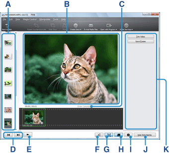| H | 顯示展開的縮圖按鈕 | 按這個按鈕,視訊將在預覽區下方顯示為一系列縮圖影像,這些影像是依預先設定的時間間隔,選取數個畫格所組成。再按一次,可隱藏縮圖影像。 |