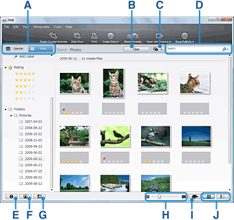 | C | 图像类型选择按钮 | 单击并选择[仅显示视频]、[仅显示照片]或[仅显示 RAW 图像文件]以筛选要显示的视频和照片。 |