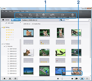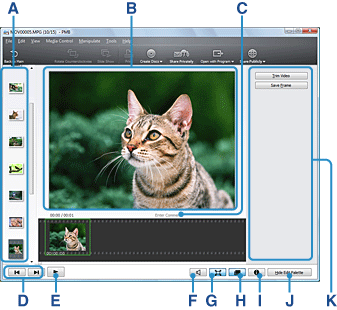 | I | 显示展开的视频缩略图按钮 | 单击以缩略图图像的方式在展开的缩略图列表中显示视频和照片组。如要隐藏展开的列表,再次单击该按钮。 在展开的缩略图列表中,视频将显示为一系列的缩略图图像,这些图像由在预定的时间间隔选取的单个帧所组成。使用高速连拍功能拍摄的照片组中的所有照片都将显示为缩略图图像。 |