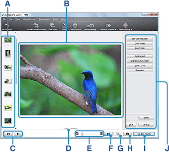 | F | 适应窗口按钮 | 单击此按钮可以在显示照片时使照片适应窗口的大小。再次单击此按钮将取消调整。 |