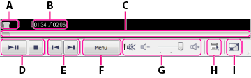 | F | Przycisk Indeks/Menu | Wyświetla listę miniatur (indeksy) dla każdej sceny. Kliknięcie miniatury podczas wyświetlania indeksu spowoduje odtworzenie danej sceny od początku. W przypadku odtwarzania dysku, który zawiera menu, ten przycisk zmienia się w przycisk [Menu]. Kliknięcie tego przycisku wyświetla menu. |